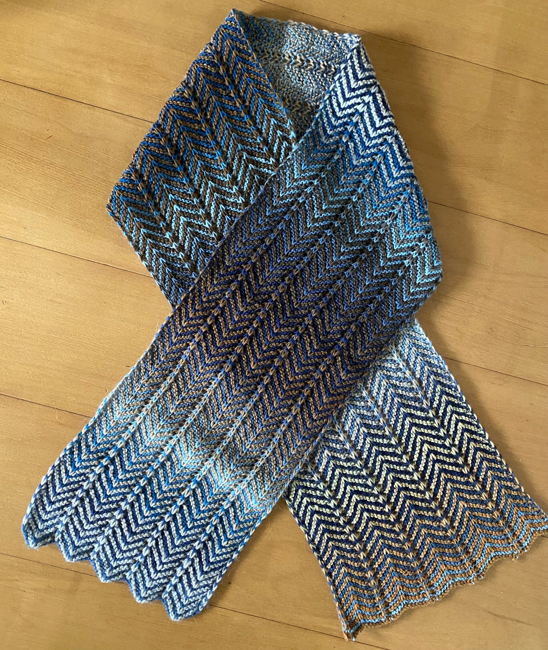 Deze eenvoudige sjaal wordt met 2 verschillende bollen in 2 verschillende kleuren verloopgaren gebreid. Steeds 2 naalden met de ene bol en 2 naalden met de andere bol. Door de dubbele meerderingen en minderingen krijgt de sjaal een golvend effect, vandaar de naam “Golf” 😉 !