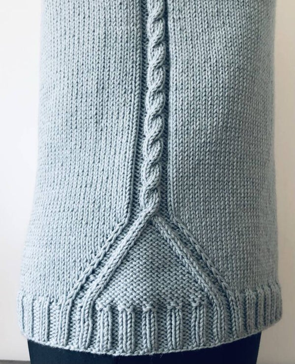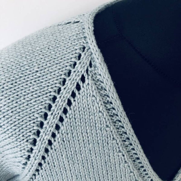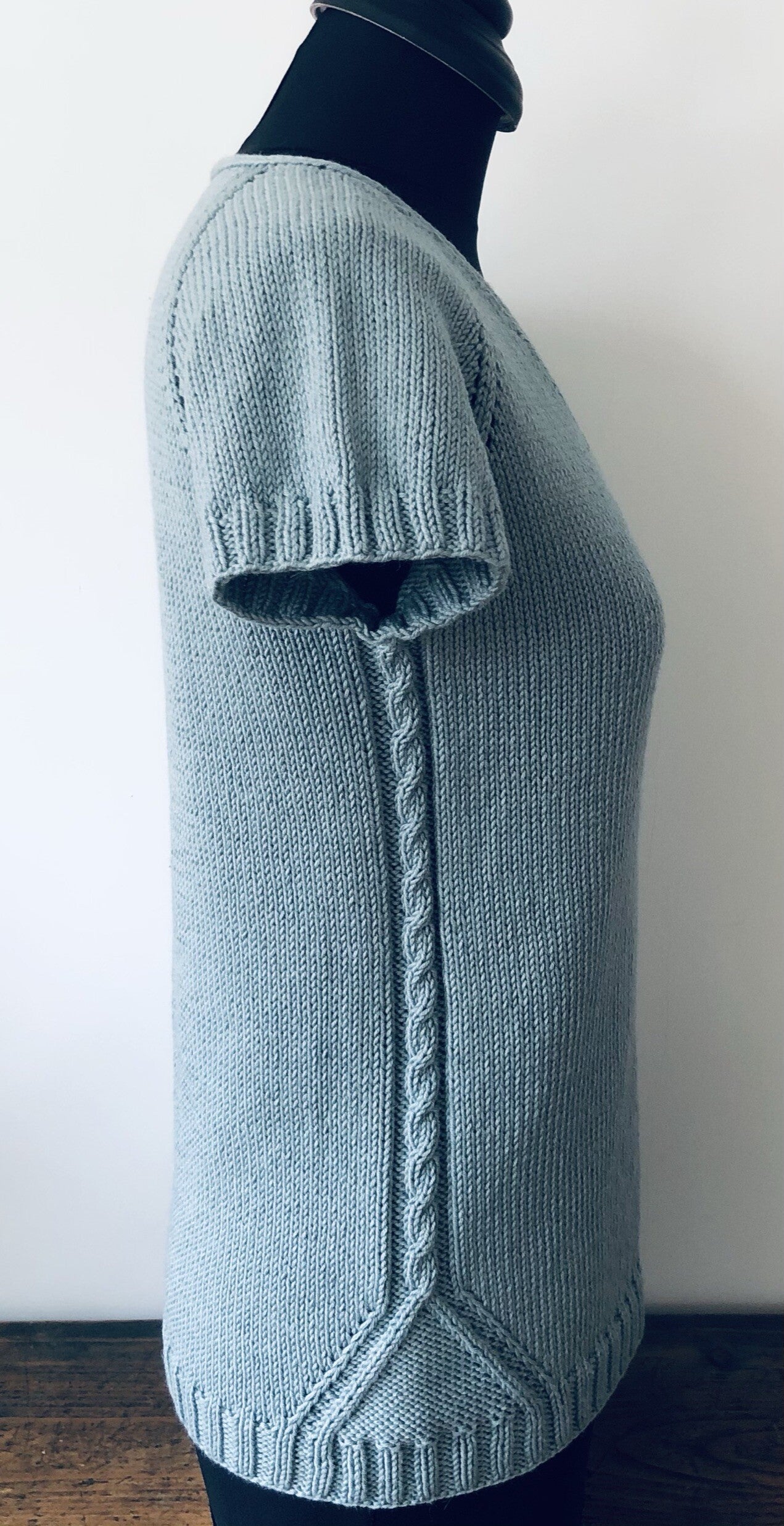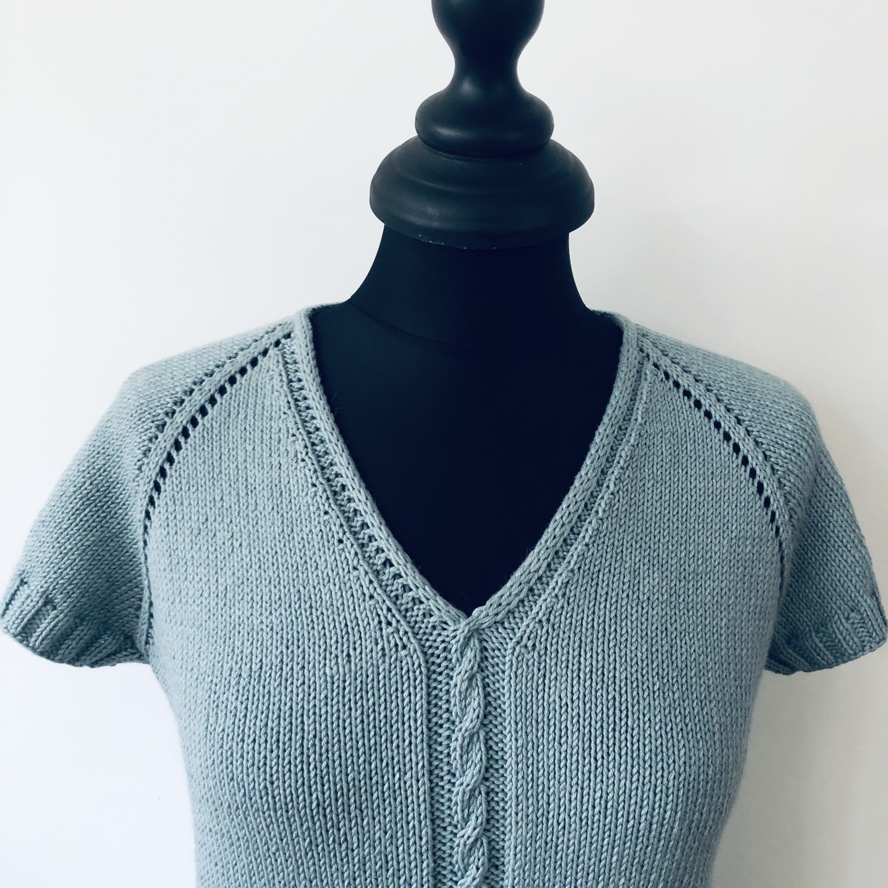 Dit truitje met korte mouwen wordt naadloos, recht (zonder minderingen voor de taille) van boven naar beneden gebreid met een V-hals middenvoor en raglanmeerderingen in de pas. Tot aan het einde van de V-hals wordt het truitje heen en weer gebreid, daarna wordt verder gebreid in het rond, met een kabel middenvoor.