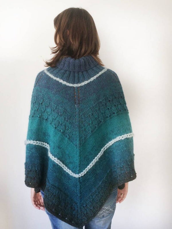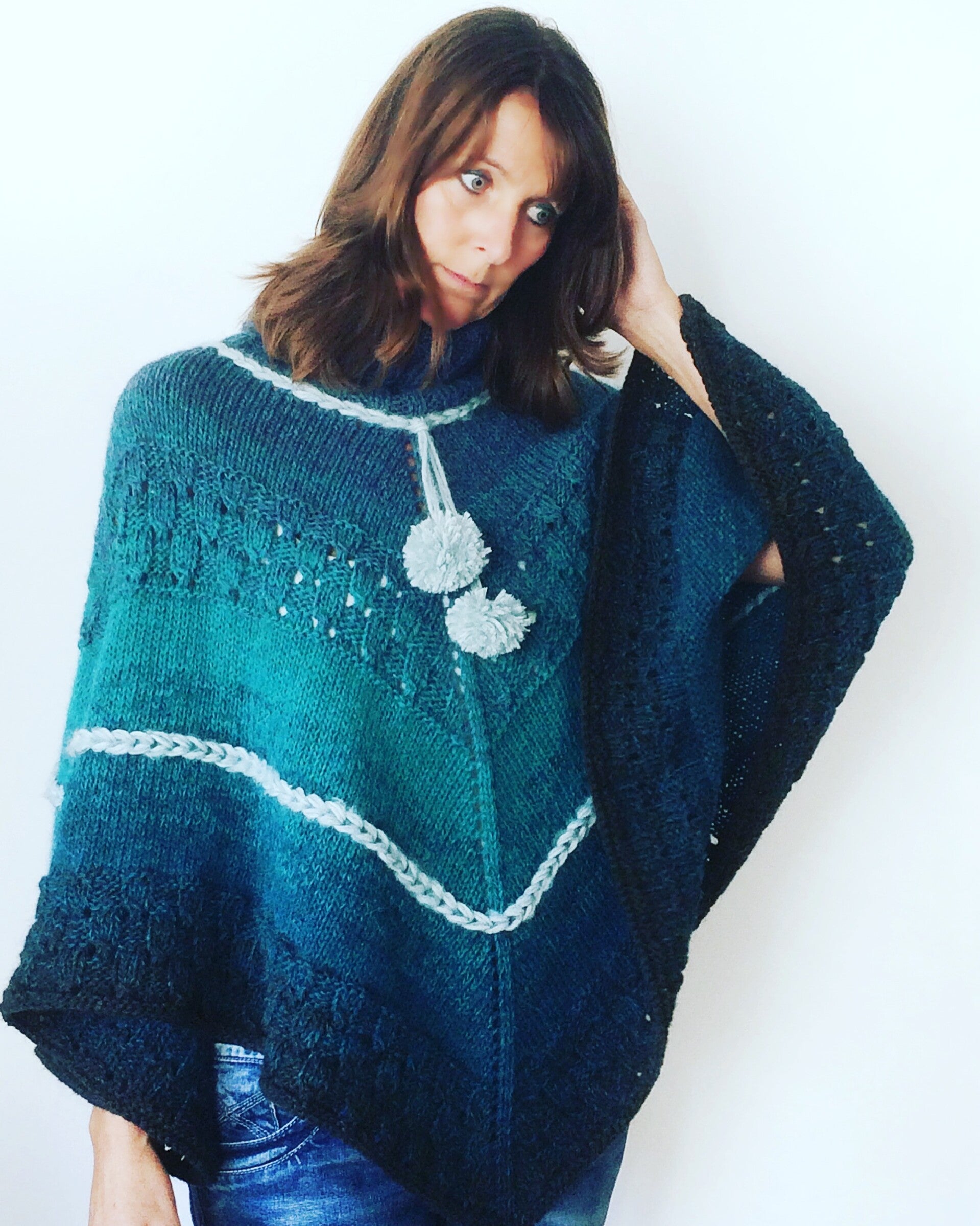 PonchitoXL wordt top-down gebreid, zonder naden, in het rond. Om de naald wordt er gemeerderd op 4 punten, wordt er een fantasiesteek in verwerkt én wordt er naderhand met een haaknaald een sierrand op gehaakt. De pompons zijn optioneel, die geven de poncho een speels effect, maar kunnen er net zo gemakkelijk weer afgehaald worden of weg worden gelaten.