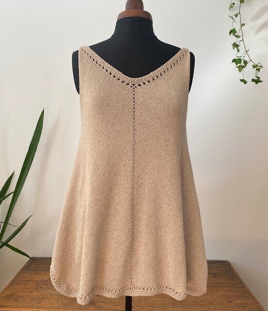 Deze ruimvallende A-lijn top wordt naadloos van boven naar beneden gebreid. De halslijn wordt eerst in ribbelsteek in het rond gebreid, dan worden voor- en achterpand apart verder gebreid tot de armsgaten de juiste lengte hebben. Daarna wordt weer verder gebreid in het rond. Door de meerderingen middenvoor en middenachter, elke 2e nld/toer, ontstaat er een A-lijn. De top heeft een golvende zoom, door de verkorte toeren onderaan het lijf, die het geheel een speels uiterlijk geven.